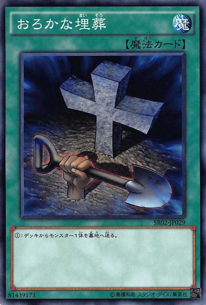 원작에서 죠노우치가 처음 사용했을때는 자신의 묘지에 있는 카드를 상대 묘지로 보내버리는 괴상한 카드였다. 말 그대로 어리석은 매장. 이 효과와 도굴꾼의 연동으로 인조인간 사이코 쇼커를 불러내 아포피스의 화신 3마리를 털어버렸다. 원작 그대로였다면 금지 제한에 걸릴 날은 절대로 없었다.