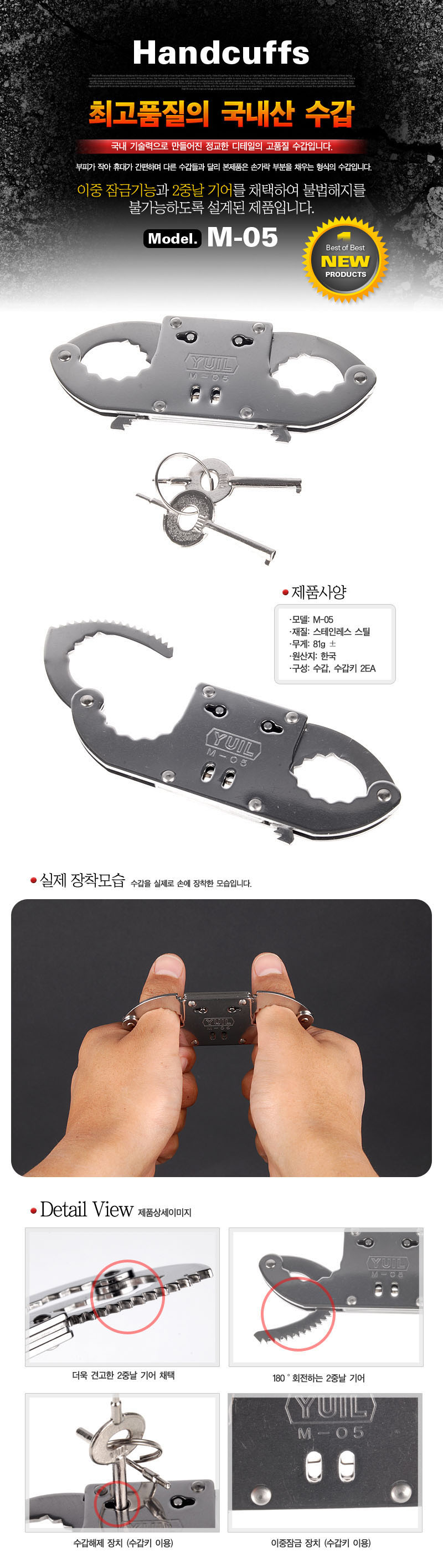 현재 경찰 장구로 지정되어 있긴 하지만혹시 아닐 수도 있고 변경될 수도 있으니 자세한건 아시는 위키러가 추가바람 살면서 경찰관들이 수갑 쓰는 것도 실제로 현장 목격하기가 쉽지는 않은 판국인데 엄지수갑을 실전에서 경찰관들이 쓰는 경우는 찾기가 드물다. 거의 없다시피하다.