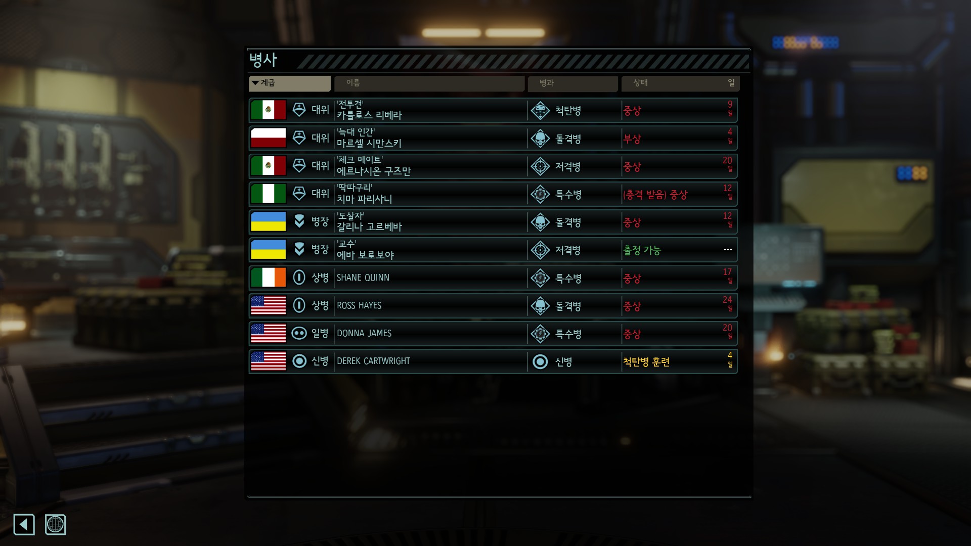 - 각 대원들마다 일지도 있다. 대원들의 프로필을 살펴보면 대개 2001~2009년생으로 설정되어 있고 어드밴트에게 잡혔다 탈출한 비정규 민병대, 과거 XCOM 전쟁 당시 손꼽히는 장교, 범죄자인데 재미로 외계인을 죽인다는 사람, 무기밀매상 출신 등등 다양한 사연이 있다. 이 일지는 플레이어가 직접 수정할수도 있는데, 덕분에