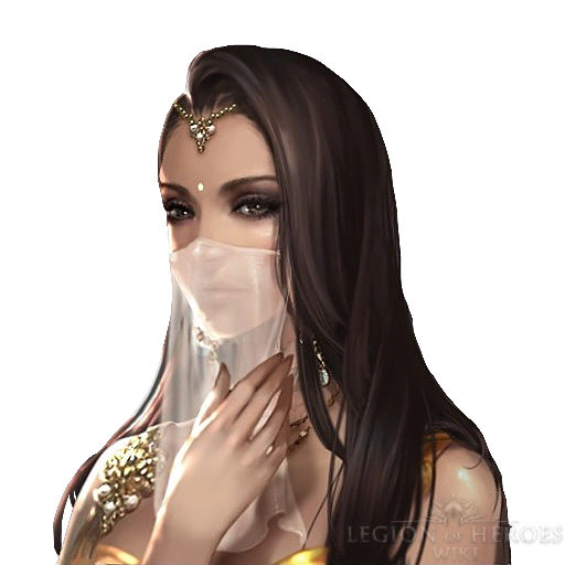 | 영웅 설명 | 바빌로니아 왕국에서 가장 이름 높은 무희. 왕궁에서 일하는 하녀 출신이었으나, 특유의 총명함으로 술탄의 눈에 띄게 된다. 기회를 놓치지 않고 자신의 장기인 춤을 선보여 왕궁 무희가 된 그녀는 역대 최단기간에 가장 실력 있는 무희에게 주어지는 매혹의 무희 라는 영예로운 칭호를 얻게 된다. 하지만 세간에 알려진 바와 달리 매혹의 무희가 되기 위한 필수조건은 높은 무술실력이며, 최우선 임무는술탄의 호위이다. | |