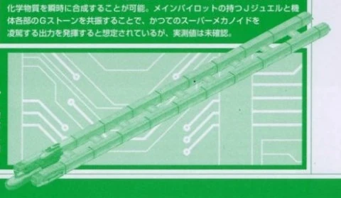 | 화학물질을 순식간에 합성하는게 가능. 메인 파일럿이 지닌 J쥬얼과 기체 각부의 G스톤을 공진시켜서, 한때의 슈퍼 메카노이드를 능가하는 출력을 발휘하도록 상정되어 있지만, 실측치는 미확인. |