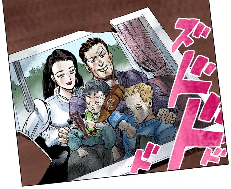 니지무라 케이초와의 싸움이 끝난 이후 스탠드 구현의 화살을 수거하기 위해서 저택을 뒤지던 히가시카타 죠스케와 히로세 코이치가 처음 발견하였다. 처음엔 그야말로 정체불명에 괴물 비주얼이라 코이치와 죠스케 둘 다 질겁했지만, 그 후 케이초가 나타나서 자신들의 아버지라는 것을 밝힌다.