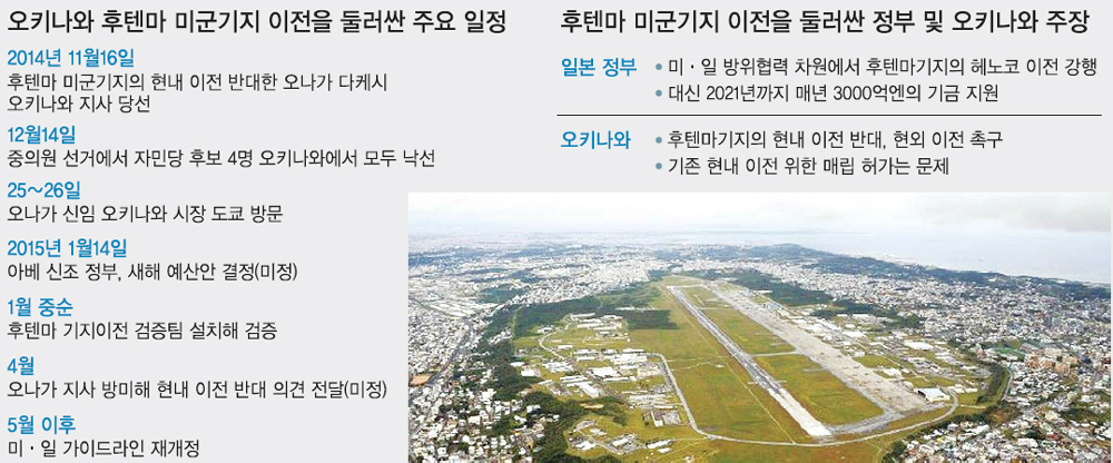 하지만 아베 정부는 후텐마 기지의 헤노코 이전은 예정대로 진행돼야 한다는 입장이다. 스가 관방장관은 “헤노코 이전은 기정사실”이라며 타협이나 양보가 있을 수 없다는 점을 분명히 하고 있다. 오히려 “오나가 지사가 (헤노코 이전에 대한) 태도를 바꾸지 않은 채 만나봐야 의미가 없다”며 지사와 면담하지 않을 방침이라고 니혼게이자이 신문은 전했다.