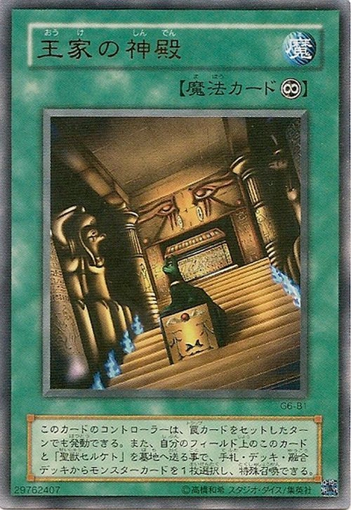 | "왕가의 신전"의 ①②의 효과는 각각 1턴에 1번밖에 사용할 수 없다. ①: 자신은 함정 카드 1장을 세트한 턴에 발동할 수 있다. ②: 자신 필드의 앞면 표시의 "신성한 몬스터 셀케트" 1장과 이 카드를 묘지로 보내고 이 효과를 발동할 수 있다. 패 / 덱의 몬스터 1장 또는 엑스트라 덱의 융합 몬스터 1장을 특수 소환한다. | ||||