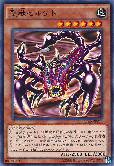 | 이 카드의 컨트롤러는 함정 카드를 세트한 턴에 발동할 수 있다. 또 자신 필드 위의 이 카드와 "신성한 몬스터 셀케트"를 묘지로 보내는 것으로 패 / 덱 / 융합 덱에서 몬스터 카드를 1장 선택하여 특수 소환할 수 있다. | ||||