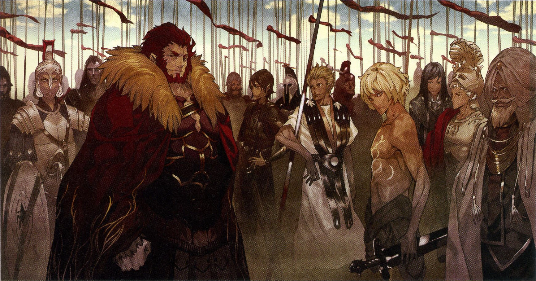 - 이스칸다르 사후 갈라진 나라에서 왕조를 세운 자들 등도 언급되었다. 그런데 소설 삽화는 팔랑크스다(…). 드라마 CD 삽화는 그나마 실제 보구와 비슷해보이는 다국적 영령들.