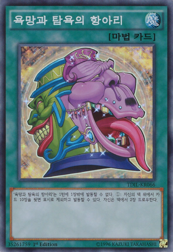 | "욕망과 탐욕의 항아리"는 1턴에 1장밖에 발동할 수 없다. ①: 자신의 덱 위에서 카드 10장을 뒷면 표시로 제외하고 발동할 수 있다. 자신은 덱에서 2장 드로우한다. | ||||