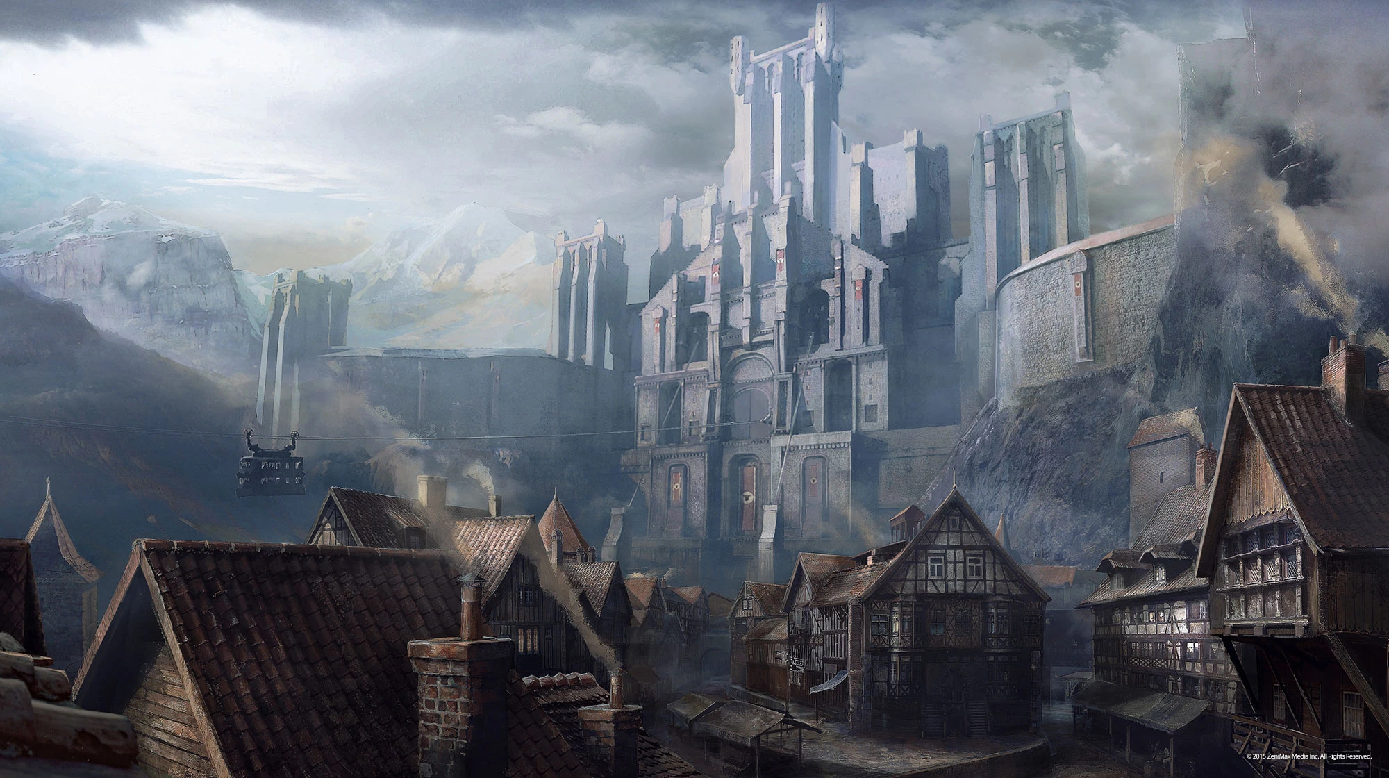 울펜슈타인: 디 올드 블러드에서의 울펜슈타인 성과 불프부르크 마을.무슨 RPG 게임에 나올 법한 배경이다