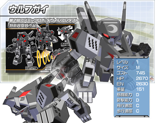 한마리 외로운 늑대를 자칭하는 변형 육전 로봇. 고고한 노선으로 개발된 변형장치는 기존의 다른 파츠와는 결코 어울리지 않는다. 이족형태와 사족형태를 자유자재로 구사하여 싸워나가자.