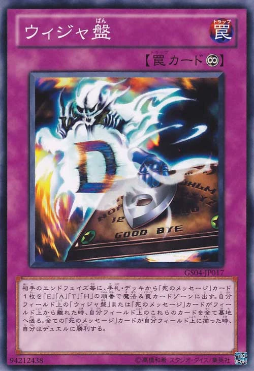 | 이 카드와 "죽음의 메시지" 카드 4종류가 자신 필드에 모였을 때, 자신은 듀얼에 승리한다. ①: 상대 엔드 페이즈에 이 효과를 발동한다. 패 / 덱에서, "죽음의 메시지" 카드 1장을 "I" "N" "A" "L"의 순으로 자신의 마법 & 함정 존에 낸다. ②: 자신 필드의 "위저 보드" 또는 "죽음의 메시지" 카드가 필드에서 벗어났을 때에 자신 필드의 "위저 보드" 및 "죽음의 메시지" 카드는 모두 묘지에 보내진다. | ||||