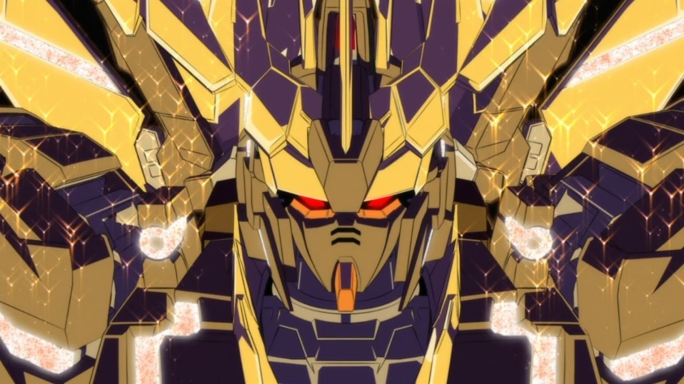 - 사이코 프레임을 최대한 공명시켜 콜로니 레이저의 방어에 나선 유니콘 건담과 밴시. 그러나 완전히 각성하지 못한 밴시는 콜로니 레이저의 무시무시한 힘을 견디지 못하고 파괴되려는 순간, 여태까지 자신이 차고 다녔던 부적을 떠올리게 되고 각성에 이른다.[18] 각성한 밴시의 힘과 빛의 결정체를 발생시킨 유니콘 건담의 활약으로 사이코 필드는 완전히 저지된다.
