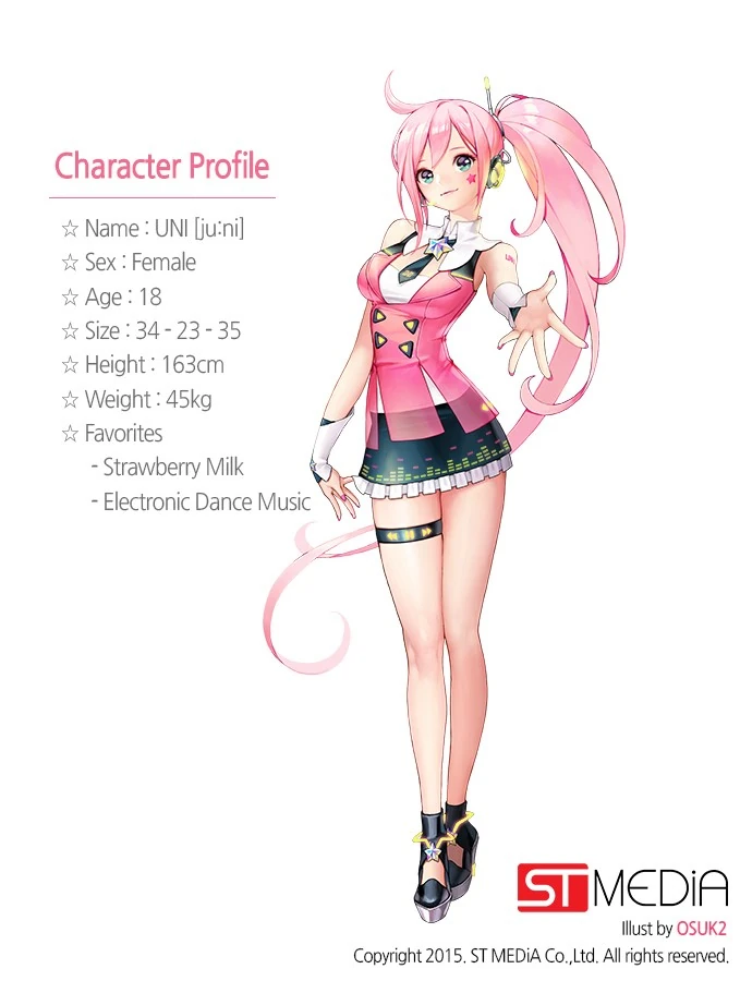 - 2015년 8월 4일, 유니의 전신 일러스트가 공개되었다! 실루엣이 공개된 게 같은날 저녁 7시였는데, 보컬로이드 팬들의 화력으로 인해 저녁 9시 30분, 단 2시간 30분만에 보컬로이드 톡스의 좋아요 수가 300개를 넘어버린 것. 일러스트레이터는 OSUK2(오숙이), "유니의 기본 콘셉트는 딸기우유이며, 목의 카라와 손목 액세서리, 기본 컬러에서 한국적인 느낌을 살렸다"고 ST미디어 관계자가 언급했다.