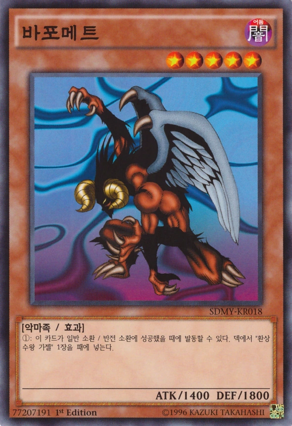 ①: 이 카드가 파괴되었을 때, 자신 묘지의, "바포메트" 또는 "환상수왕 가젤" 1장을 대상으로 하고 발동할 수 있다. 그 몬스터를 특수 소환한다.