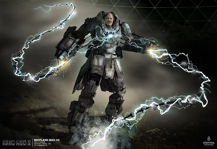 이후 완성된 수트를 입고 모나코 레이싱에 출전한 토니 스타크를 습격한다. 토니가 Mk.5 수트를 장착하여 대항했지만 그를 밀어붙이던 도중, 아이언맨이 최후의 수단으로 이판사판태클 돌격을 시도하는 바람에 불완전한 구형 아크 리액터를 빼앗기고 패배하고 만다.