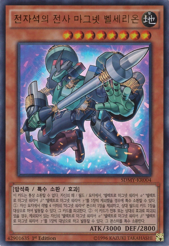 | 이 카드는 통상 소환할 수 없다. 자신의 패 / 필드 / 묘지에서 "엘렉트로 마그넷 워리어 α" "엘렉트로 마그넷 워리어 β" "엘렉트로 마그넷 워리어 γ"를 각각 1장씩 제외했을 경우에 특수 소환할 수 있다. ①: 자신 묘지의 레벨 4 이하의 "마그넷 워리어" 몬스터 1장을 제외하고, 상대 필드의 카드 1장을 대상으로 하여 발동할 수 있다. 그 카드를 파괴한다. ②: 이 카드가 전투 또는 상대의 효과로 파괴되었을 경우, 제외되어 있는 자신의 "엘렉트로 마그넷 워리어 α" "엘렉트로 마그넷 워리어 β" "엘렉트로 마그넷 워리어 γ"를 1장씩 대상으로 하고 발동할 수 있다. 그 몬스터를 특수 소환한다. | ||||