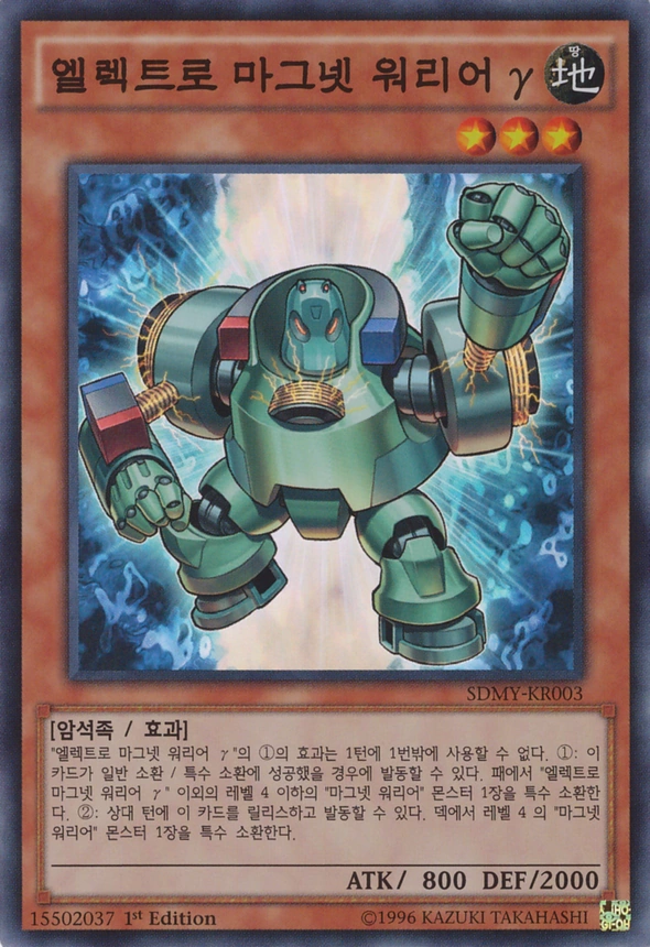 | "일렉트로 마그넷 워리어 γ"의 ①의 효과는 1턴에 1번밖에 사용할 수 없다. ①: 이 카드가 일반 소환 / 특수 소환에 성공했을 경우에 발동할 수 있다. 패에서 "일렉트로 마그넷 워리어 γ" 이외의 레벨 4 이하의 "마그넷 워리어" 몬스터 1장을 특수 소환한다. ②: 상대 턴에 이 카드를 릴리스하고 발동할 수 있다. 덱에서 레벨 4 "마그넷 워리어" 몬스터 1장을 특수 소환한다. | ||||
