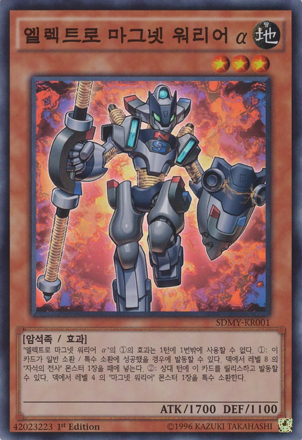 | "일렉트로 마그넷 워리어 α"의 ①의 효과는 1턴에 1번밖에 사용할 수 없다. ①: 이 카드가 일반 소환 / 특수 소환에 성공했을 경우에 발동할 수 있다. 덱에서 레벨 8 "자석의 전사" 몬스터 1장을 패에 넣는다. ②: 상대 턴에 이 카드를 릴리스하고 발동할 수 있다. 덱에서 레벨 4 "마그넷 워리어" 몬스터 1장을 특수 소환한다. | ||||