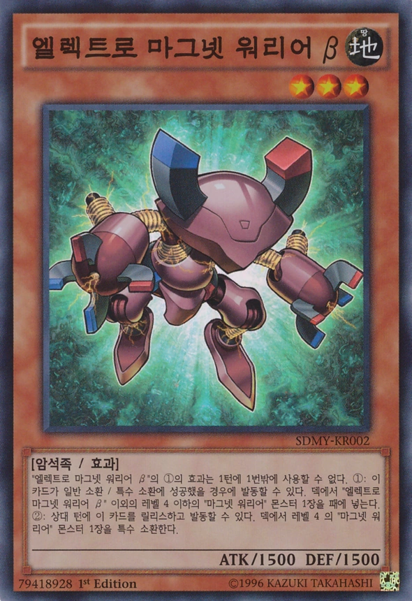 | "일렉트로 마그넷 워리어 β"의 ①의 효과는 1턴에 1번밖에 사용할 수 없다. ①: 이 카드가 일반 소환 / 특수 소환에 성공했을 경우에 발동할 수 있다. 덱에서 "일렉트로 마그넷 워리어 β" 이외의 레벨 4 이하의 "마그넷 워리어" 몬스터 1장을 패에 넣는다. ②: 상대 턴에 이 카드를 릴리스하고 발동할 수 있다. 덱에서 레벨 4 "마그넷 워리어" 몬스터 1장을 특수 소환한다. | ||||
