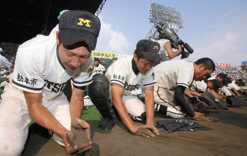 하지만 우승팀도 우승 기념으로 담아가는 경우도 많아 사실상 시기의 차이일 뿐이지 전국대회 출전학교 전부 흙을 퍼간다. 그리고 이 전통 때문에 고시엔 구장을 홈으로 쓰는 한신 타이거스는 구단 돈 들여서 고교생들이 퍼간 흙을 메꿔줘야 한다(...) 다만 패배한 팀도 2학년이나 1학년 선수의 경우 "반드시 고시엔에 다시 돌아온다"는 결의를 다지는 뜻에서 흙을 가져가지 않는 경우도 있다. 그렇다고 해서 구장의 흙을 아무데서나 막 퍼는게 아니고 덕아웃 앞에 정해진 장소가 있다. 그래서 경기가 끝날 때쯤에는 카메라 기자들이 패배가 거의 확실시 되는 팀쪽으로 향하는데 이것도 자리 경쟁이 치열하다.질 거 같은 것도 서러운데 기자들이 몰려오면 진짜 울고 싶을 듯... 기적의 역전승을 한다면??