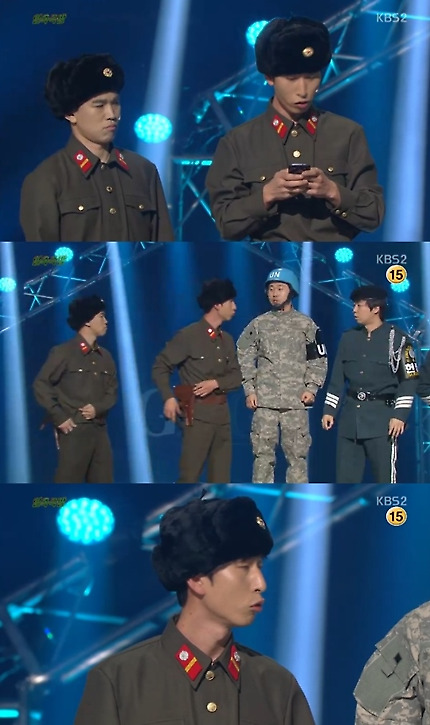 시청자 기준으로 북한군과 남한군이 각각 서쪽과 동쪽에 배치되고 UN군이 가운데에 있는거보면[1] 흡사 코미디빅리그의 아3인팀의 예전 JSA 코너와 비슷하다. 2016년 3월 20일 방영분에서는 안소미가 나왔다.