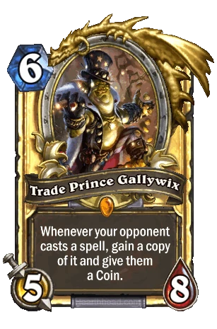 전승지기 초와 비슷한 주문 억제 하수인이다. 여러모로 전승지기 초[3]와 비교되는 카드인데, 양쪽이 사용하는 주문 모두를 상대에게 복사해주는 초와는 달리 주문 복사 효과를 자신만 누릴 수 있다. 그 대신 복사할 때마다 상대에게 동전을 주긴 하지만. 돈 주고 주문 사는 셈. 무한 동전 방지를 위해서 갤리윅스가 주는 동전은 그냥 동전과 효과는 같지만 뒤에 '갤리윅스 카드의 효과가 발동되지 않는다.'가 추가되어 있다. 동전에 박힌 보석의 색깔로도 구별할 수 있다. 일단 상대의 주문을 거의 봉쇄하는 데다가 6코스트에 5/8로 능력치도 꽤 좋으므로 상당한 압박을 줄 수 있다. 돌주먹 오우거와 공체합이 같다는것만 봐도 바닐라 스텟이 좋다는걸 알수있다. 상대 입장에선 제압기로 제거하자니 주문이 복사되니 꺼려지고 방밀은 예외로 제압과 동시에 상대 손패에 잉여카드 한 장을 던져줄 수 있지만 연계용 카드 GET 전투로 제거하자니 능력치가 저래서 잡기도 힘들다. 코스트가 크고 생존력이 강해 빅덱에 들어가면 좋겠지만 도적이 빅덱과는 거리가 좀 멀다는 것이 흠. 그러나 위니하수인덱도 하수인들을 깔아놓은뒤 이걸내면 상대는 매우 압박이다. 하지만 돚거는 위니덱도 안 굴리지 참고로 이 카드가 나오면서 같은 6코면서 스텟이 5/3인 납치법은 가루가 되도록 까이고 있다.진짜로 가루로 갈리고 있다 아무리 전설등급과 영웅등급의 차이라지만 같은 직업 카드인데 이정도 스텟차이는...