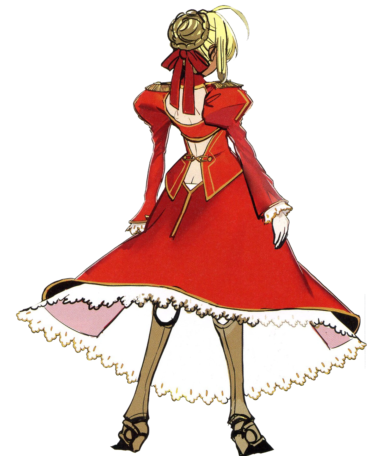 이 복장은 캐릭터 성격을 그대로 나타낸다. EXTRA의 세이버는 즉흥적이고 화려한 것을 좋아하며, 미(美)를 고집하는 성격이다. 반면 stay night의 세이버는 수수하지만 실용적인 것을 좋아한다. 이 성격의 차이점은 그 무기에서도 확실하게 알 수 있다. 그리고 파랑 세이버와 비교했을 시 키는 4cm 작은데 슴가 사이즈는 10cm 크다. 이것이 왕과 황제의 차이다
