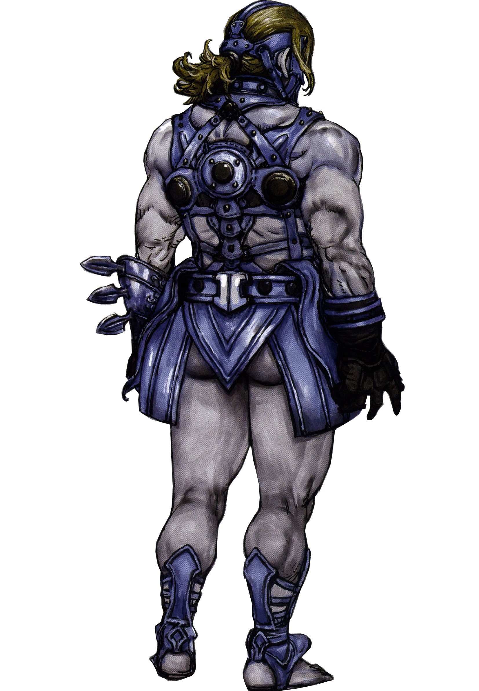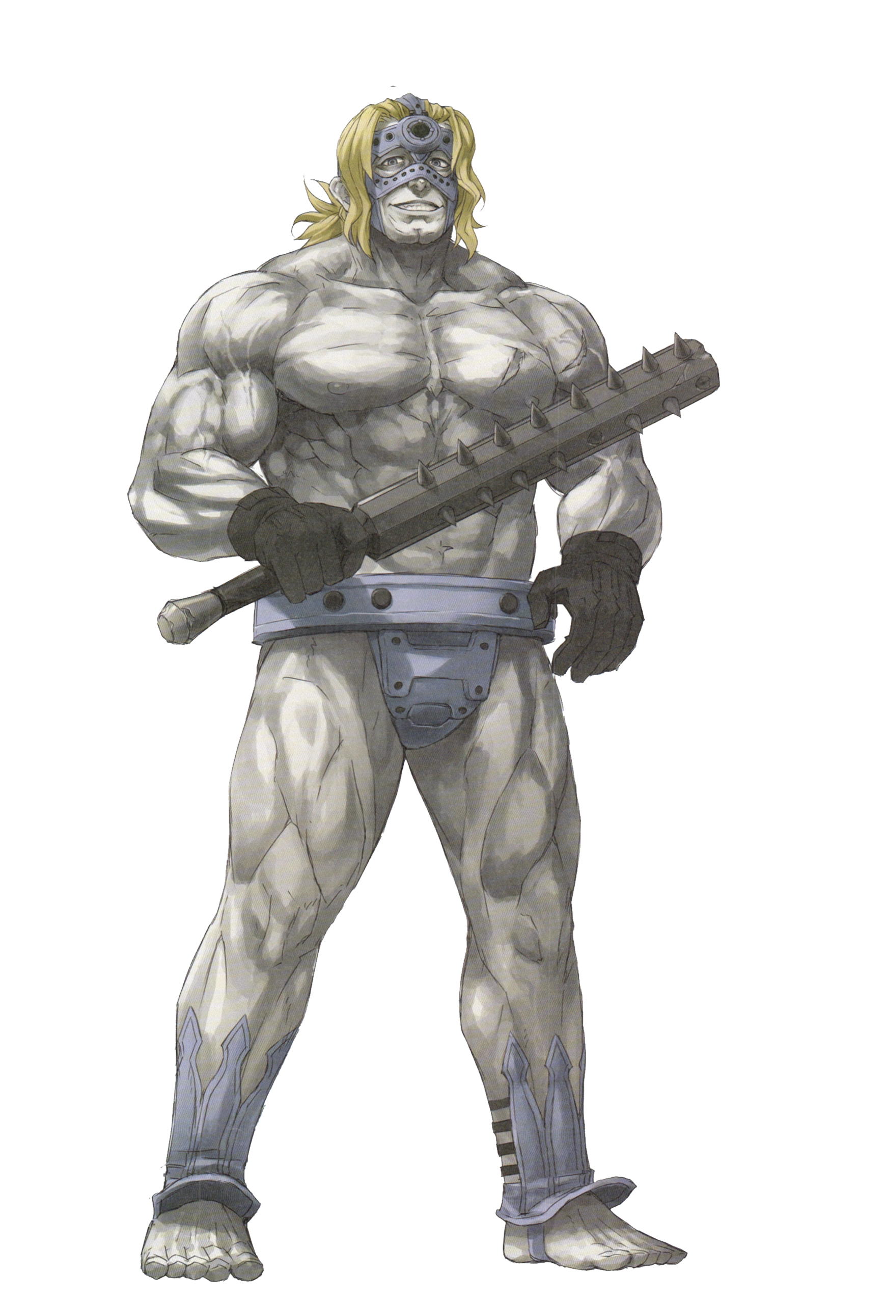 험상궃게 생긴 반나체(...)의 거한. 수많은 흉터, 시체처럼 창백한 피부, 2미터가 넘는 거구, 그리고 상상을 초월하는 압도적인 근육이 특징이다. 팔은 악어 몸통과 같고 다리는 맘모스 뒷다리과 같으며, 흉근은 아무것도 착용하지 않았음에도 마치 철판갑옷을 입은 것처럼 견고하다. 복장은 달랑 가죽쪼가리 하나로 허리와 샅을 덮은 게 전부. 가죽 벨트가 얼굴을 포함해 전신을 파고들어갈 듯이 얽매고 있지만 괴로워하는 기색은 없고 오히려 즐거운 웃음을 띤다(...). 아무리 궁지에 놓여도 미소지으며 악을 벌하고, 고통받으면서도 역전의 길을 찾는다.