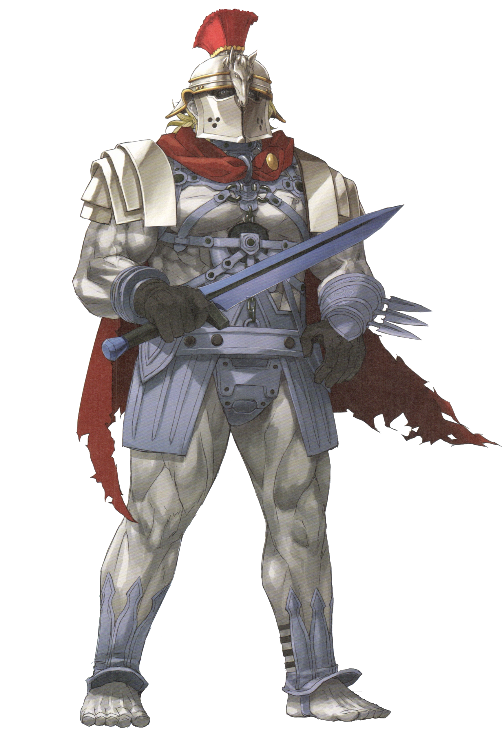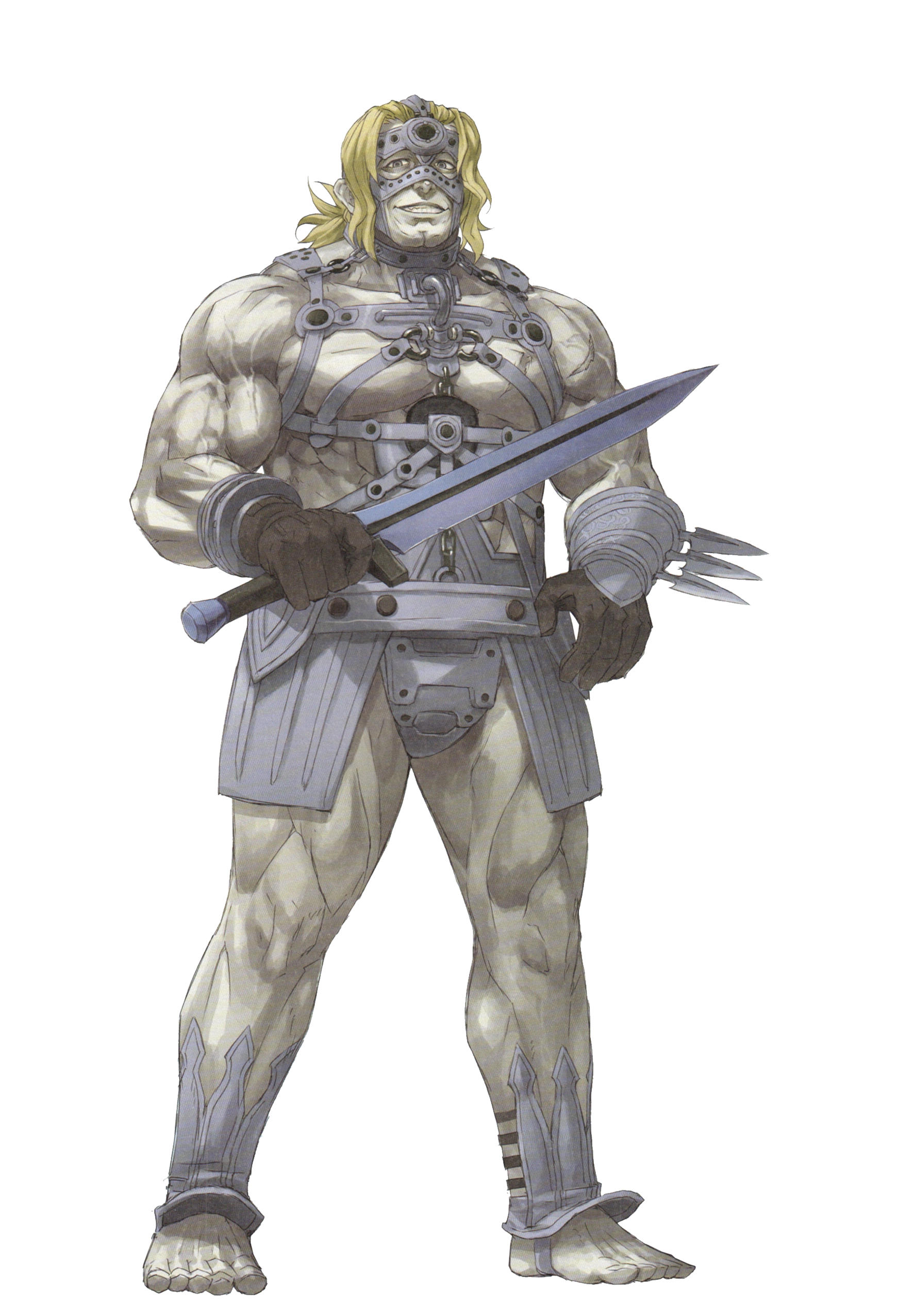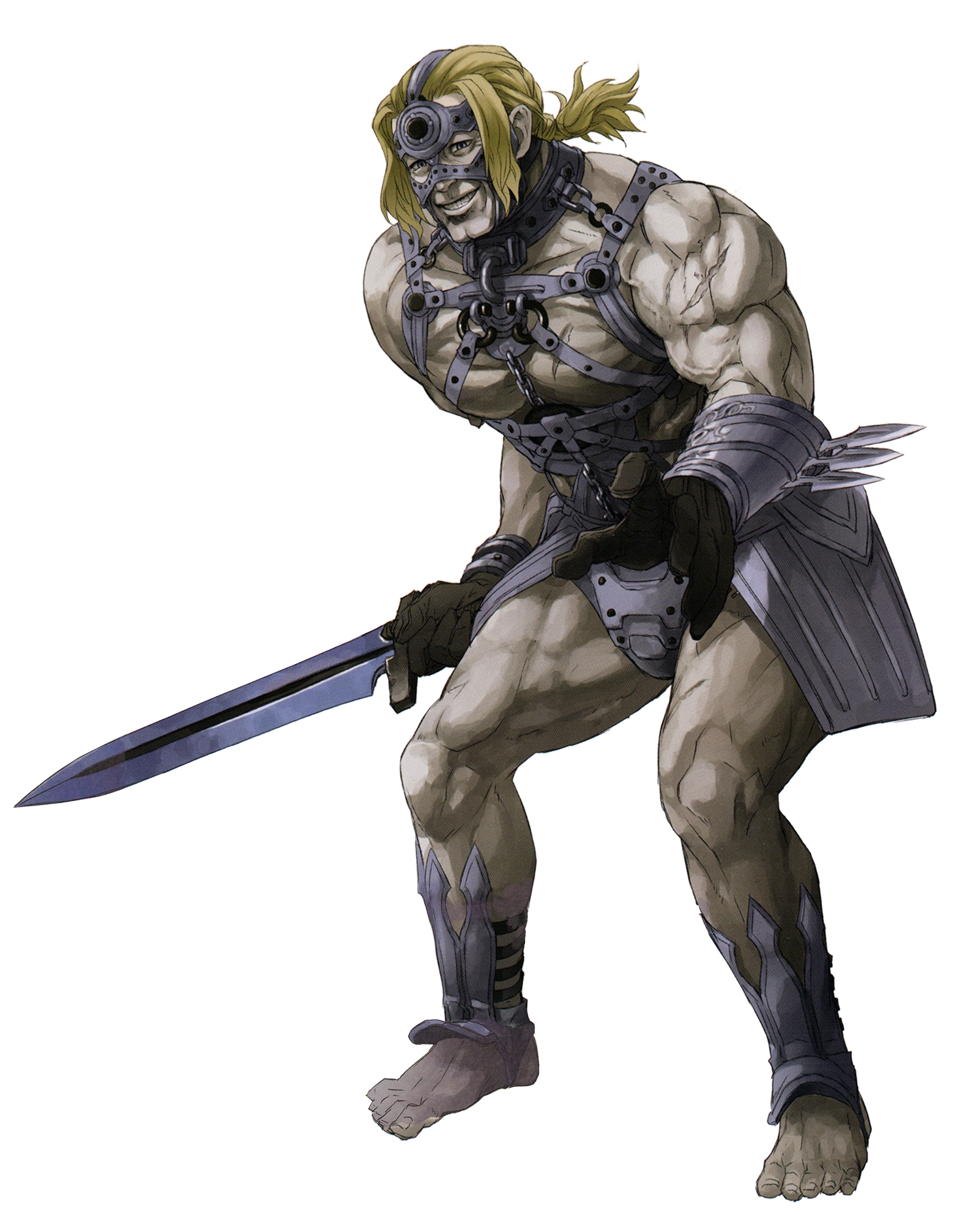 무기는 소검. 본인 덩치가 덩치다보니 쓰는 검도 이름만 소검이지 크기가 매우 큰 편. 검만 쓰기보다는 몸과 검을 함께 쓰는 스타일로 싸운다. 특이하게도 베이든 맞든 반드시 상대의 공격을 받고 나서야 반격을 취한다. 역시 M. 그 외에도 여러 명의 적을 한꺼번에 안아 수플렉스로 박살내는 등 프로레슬러처럼 싸우기도 한다. 생전에 관객들 앞에서 검투사로 활동했을 때 익힌 쇼맨십이 몸에 밴 걸지도.