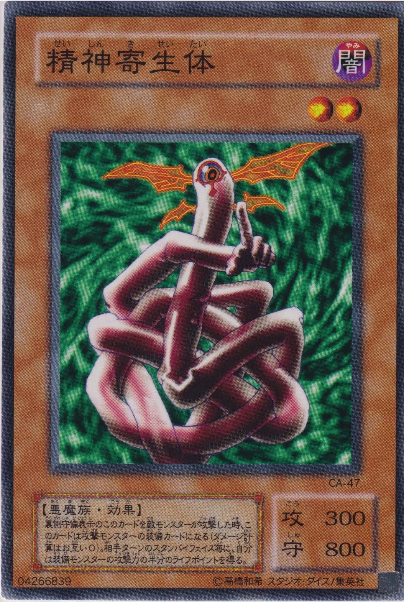 | 상대의 몬스터가 뒷면 수비 표시로 존재하는 이 카드를 공격했을 때, 이 카드는 장착 카드가 되어 공격한 몬스터에게 장착된다.(데미지 계산은 하지 않는다.) 상대의 스텐바이 페이즈마다, 자신의 라이프 포인트를 이 카드가 장착된 몬스터의 공격력의 절반만큼 올린다. | ||||