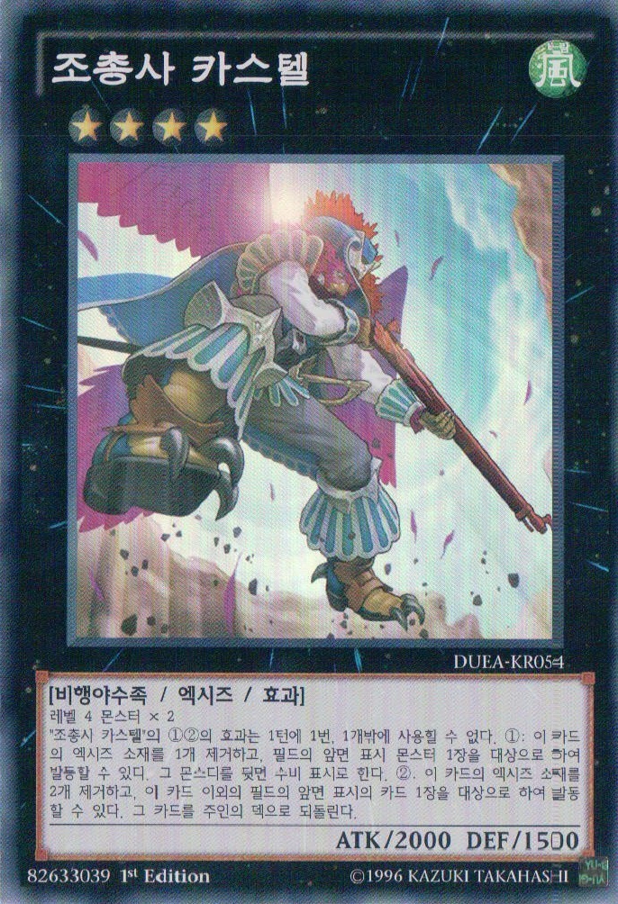 | 레벨 4 몬스터 × 2 "조총사 카스텔"의 ①②의 효과는 1턴에 1번, 1개밖에 사용할 수 없다. ①: 이 카드의 엑시즈 소재를 1개 제거하고, 필드의 앞면 표시 몬스터 1장을 대상으로 하여 발동할 수 있다. 그 몬스터를 뒷면 수비 표시로 한다. ②: 이 카드의 엑시즈 소재를 2개 제거하고, 이 카드 이외의 필드의 앞면 표시의 카드 1장을 대상으로 하여 발동할 수 있다. 그 카드를 주인의 덱으로 되돌린다. | ||||