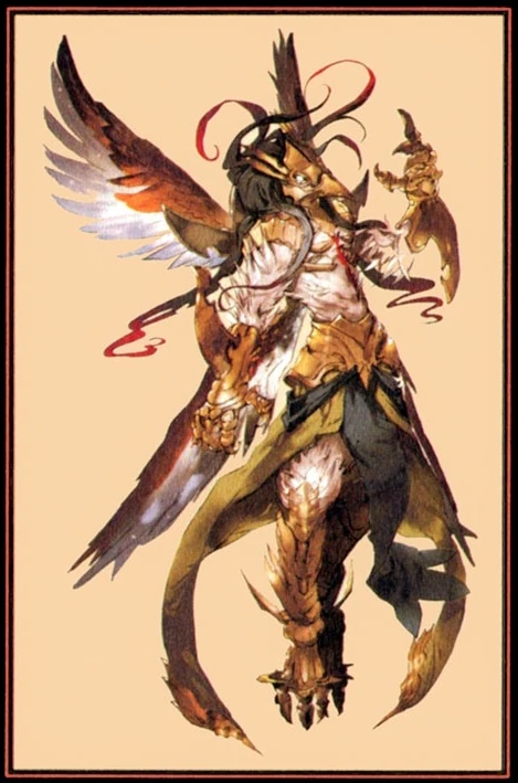 | 기이한 외견이었다. 인간의 몸에, 머리는 기괴하게 생긴 문어와도 같았다. 머리의 오른쪽 절반을 문신으로 덮었는데 이는 모종의 문자가 삐뚤삐뚤 새겨진 것이었다. 그것은 이곳으로 들어올 때 문에서 보았던 문자와도 비슷했다. 피부색은 시체처럼 하얀색에 살짝 보라색이 섞였으며 점액으로 뒤덮인 듯 기이한 광택을 발했다. 손가락은 가느다란 것이 네 개 돋아났으며 손가락 사이에는 물갈퀴가 있다. 그가 입은 것은 온통 검은색에 은색 장식이 가미된, 몸에 착 달라붙는 가죽 광택을 가진 옷이었다. 여기에 수많은 벨트를 늘어뜨리고 검은 망토를 걸쳐 앞에서 여며놓았다. 그야말로 이형종이라고밖에 부를 수 없는 존재는, 입가에서 돋아나 허벅지 언저리까지 내려올 법한 여섯 개의 긴 촉수를 꿈틀거리며, 눈동자가 없는 푸르스름하고 탁한 눈을 일행에게 돌렸다.[22] |