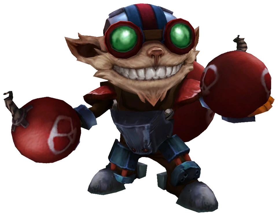 - 아무것도 안하고 가만히 세워두면 비교적 얌전히 서있는 다른 챔피언들과는 달리, 온몸이 근질근질한 듯이 "에이이이잉에이씨이이이이!!!" 거리면서 끙끙거리거나 "아오 이거 왜이래!!"라면서 들고있는 폭탄 소리를 들어보다 자기 머리로 치는 등[19] 안절부절 못하는 모습을 보여준다. 문제는 이 소리가 수풀 안에서 적에게도 들리냐 안 들리냐로 말이 많았는데 들리지 않으니 걱정하지 말자. 여담으로 이 동작(...)은 라이엇 직원의 춤이라고(...) 알고 계셧나요? 에서 나온다.