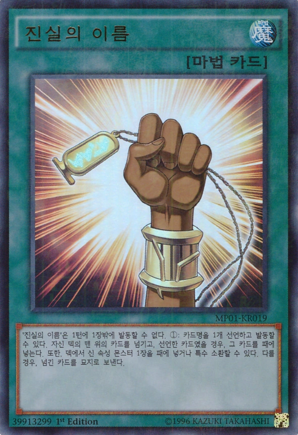 | "진실의 이름"은 1턴에 1장밖에 발동할 수 없다. ①: 카드명을 1개 선언하고 발동할 수 있다. 자신의 덱 맨 위의 카드를 넘긴다. 선언한 카드였을 경우, 그 카드를 패에 넣는다. 추가로, 덱에서 신 속성 몬스터 1장을 패에 넣거나 특수 소환할 수 있다. 아니였을 경우, 넘긴 카드를 묘지로 보낸다. | ||||