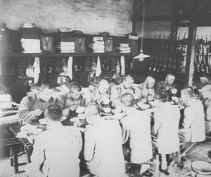 일본군을 비롯한 일부 부대들이 이런식으로 밥을 먹었다. 물론 당시 일본군 내무반은 기본적으로 침대형 내무반이었고 방 가운데에 테이블이 있는 구조여서 침상형 내무반보다 밥먹기 편했다.# 생활관 항목 참조.
