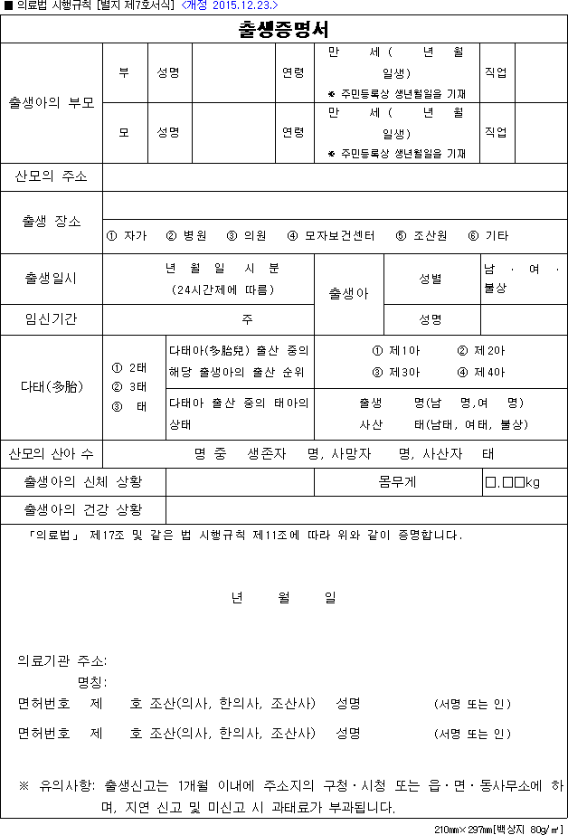 - 출생증명서 : 대충 아래처럼 생겼다(의료법 시행규칙 [서식 7]). 아래에 열거된 서류들이 생략가능하거나 특수한 경우에만 첨부하는 것인 것과 달리, 출생증명서는 일반적으로(=무조건) 첨부해야 하는 서류이다(가족관계의 등록 등에 관한 법률 제44조 제4항).
