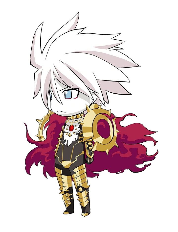 아무렇게나 기른 흰색 머리칼, 조용한 투지가 깃든 잘 갈린 검과 같은 눈빛, 가슴팍에 박힌 붉은 돌, 그리고 거룩한 빛을 발하는 황금갑옷이 어우러져 요염한 아름다움을 내뿜는다. 하지만 전체적으로 보면 아름다움을 넘어서 쓸쓸하고 처절한 인상을 주는 어쩐지 기묘한 청년. 얼굴도 가면을 쓴 것 마냥 거의 딱딱하게 굳은 표정을 짓고 있다.