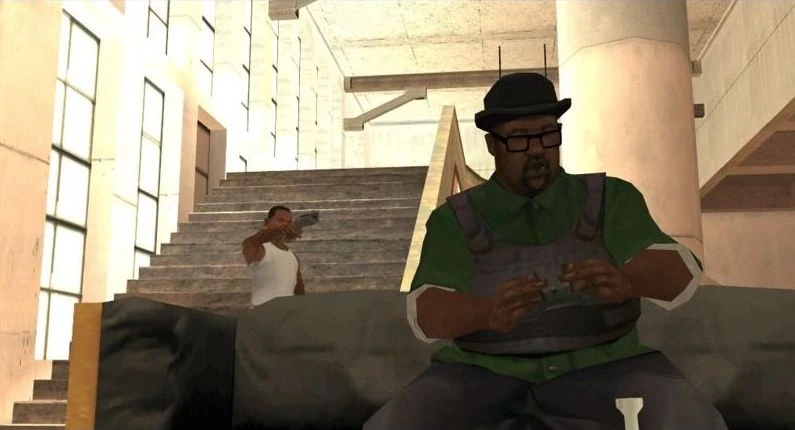 - ↑ 여담으로 빅 스모크가 착용하고 있는 방탄복 내구도가 상당하다. 미니건, 전기톱으로 손쉽게 제압이 가능하나 평범한 총기류로는 한참 걸릴 정도. 확실히 CJ가 착용한 방탄복보다 월등히 내구도가 높다. 일종의 보스 캐릭터 보정인 듯.