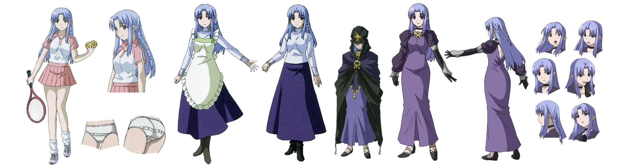 덤으로 이리야의 캐스터 폼으로 보면 캐스터가 전투 복장을 입을때 안에 입는 내부의 속옷은 T팬티거나 끈 팬티다. 이 외에도 치마의 다리 트임이 오리지널 이상으로 길게 갈라져있다. 노출되는 다리가 허벅지 위까지 보일정도.상체도 손목이외는 보이지도 않게 꽁꽁 싸맨 오리지널과는 달리 등과 어깨가 훤히 노출된 상태.