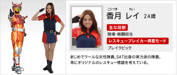 레스큐 포스의 2기 멤버. R3로 변신하며 SWAT(경찰 특수부대) 출신의 여성 대원으로 격투기가 특기. 자신의 특기인 격투기로 구조현장 뿐만 아니라 네오테라의 전투에서도 엄청난 활약을 펼친다. 곤란한 상황에 처해 있는 사람들을 돕는 일을 좋아한다. 의외로 약점은 작은 동물인데 35화에서 재난으로 위기를 겪고 있는 토끼를 구해주게 됨으로서 약점을 극복했다.