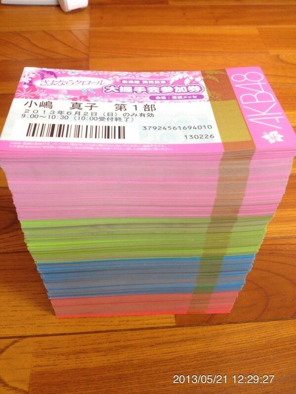 さよならクロール>> 악수회 당시 어떤 오타쿠가 코지마 마코의 악수권을 정확히 1,565장 사서 인증했다.관련 스레 그런데 이 오타쿠는 어찌된 영문인지 악수권과 함께 들어있는 투표권은 야후 옥션에 올려서 다른 오타쿠에게 전매해버렸다. 이 오타쿠가 코지마 마코에게 투표했다면 순위권에 들어갈 가능성이 좀 높아졌을지도 모른다.[5] 아무튼 이러한 오타쿠들의 파워에 힘입어 아직 정규멤버로 승격한지 얼마안된 14기생이면서 악수회에서 20부를 배정받고 20부를 완매하는 등의 14기생 에이스라는걸 증명하고 있다.