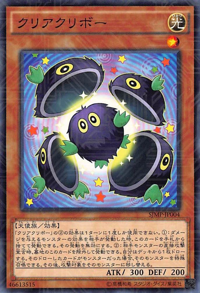 | 클리어 크리보의 ②의 효과는 1턴에 1번밖에 사용할 수 없다. ①: 데미지를 주는 몬스터의 효과를 상대가 발동했을 때, 이 카드를 패에서 버리고 발동할 수 있다. 그 발동을 무효로 한다. ②: 상대 몬스터의 직접 공격 선언시, 묘지의 이 카드를 제외하고 발동할 수 있다. 자신은 덱에서 1장 드로우한다. 그 드로우한 카드가 몬스터 카드였을 경우, 그 몬스터를 특수 소환할 수 있다. 그 후, 공격 대상을 그 몬스터로 옮긴다. | ||||
