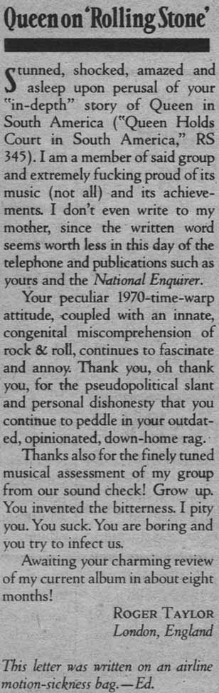 한 번은 롤링스톤의 한 기자가 공연 전 사운드체크만 듣고 공연 전체를 본 양 리뷰를 실어놓자 격분한 로저가 항의욕 편지를 보내기도 했다. 내용의 요지는 나는 우리 어머니에게조차 편지는 쓰지 않는데 당신은 너무 쓰레기라 이 편지로 좀 알려줘야겠다는 것.(...) 이로 인해 음악성에 비해 저평가가 심하다는 여론이 많다. 가령, 'The March of the Black Queen'이나 'The Prophet's Song'과 같은 곡들은 퀸 팬들이나 클래식 락 팬들 사이에선 명곡로 인정받지만 일반 대중에게 인지도는 시궁창(...) 하지만 Hot Space나 당시 유행했던 팝 사운드에 편승해 다채로움이 없어지고 그들의 전문분야가 아니었던 신디사이저의 롤이 커진 80년대 앨범들은 상업적 성공 여부와 관계없이 팬들에게도 좋은 소리를 듣지 못하거나 호불호가 갈리는 상황.