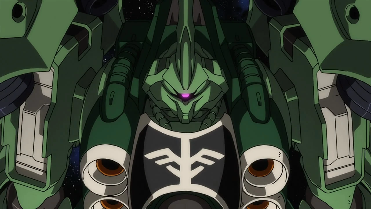 인더스트리얼7 주역에 연방이 위치했다는 것을 알아채고 출격. 단 1기로 넬 아가마의 모빌슈트 부대를 쓸어버리며 인더스트리얼7을 엉망진창으로 만들어 놓는다. 불길 속에서 유니콘 건담이 이쪽을 향해 오는 것을 알아채고 유니콘을 공격하지만 유니콘에게 밀려 인더스트리얼7에서 빠져나온다. 그 후, 유니콘은 NT-D를 발동. 결국 유니콘에게 밀리고 진네만의 명령으로 유니콘을 재치고 퇴각한다.