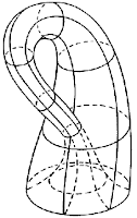 한편, 이 도형을 4차원 방향으로 뒤집으면[5] 대략 아래와 같이 전혀 막히거나 겹쳐지는 부분이 없는 형태가 나온다. 쉽게는 그냥 클라인 병이 유령(...)과 같이 실체가 없어서 스스로를 통과할 수 있다고 생각하고 뒤집는다 상상하면 된다. 그럼 고무줄이 두번 꼬인 듯한 모습이 연상될 것 이다. 보통은 그냥 저런 것도 있다는 것만 알면 된다.