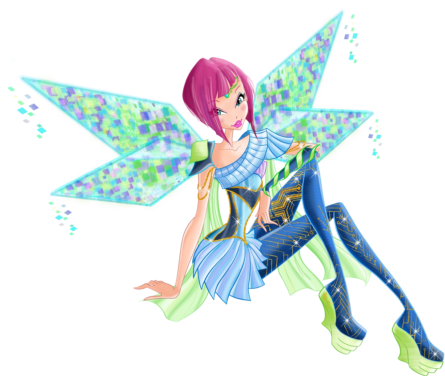 - ↑ 특이하게 공작새를 연상시키는 모양이다. 테크나와 잠자리 모양 날개인 레일라를 제외하면 다들 나비모양 날개다