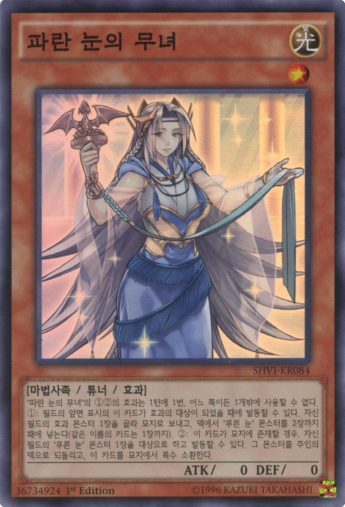 | "파란 눈의 무녀"의 ①②의 효과는 1턴에 1번, 어느 쪽이든 1개밖에 사용할 수 없다. ①: 필드의 앞면 표시의 이 카드가 효과의 대상이 되었을 때에 발동할 수 있다. 자신 필드의 효과 몬스터 1장을 골라 묘지로 보내고, 덱에서 "푸른 눈" 몬스터를 2장까지 패에 넣는다(같은 이름의 카드는 1장까지). ②: 이 카드가 묘지에 존재할 경우, 자신 필드의 "푸른 눈" 몬스터 1장을 대상으로 하고 발동할 수 있다. 그 몬스터를 주인의 덱으로 되돌리고, 이 카드를 묘지에서 특수 소환한다. | ||||
