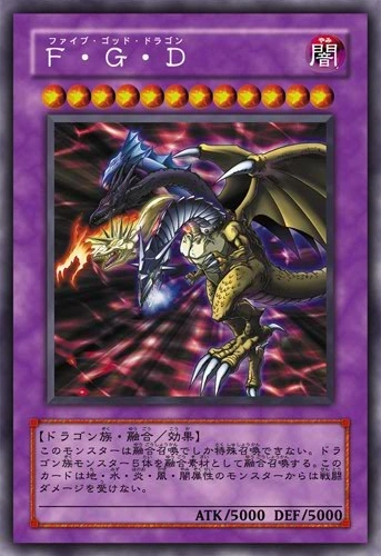 | "F·G·D -파이브 갓 드래곤-"의 의식 소환에 필요. 5턴 이내에 필드나 패에서 땅 · 물 · 화염 · 바람 · 어둠 속성의 몬스터를 릴리스 해야 한다. | ||||