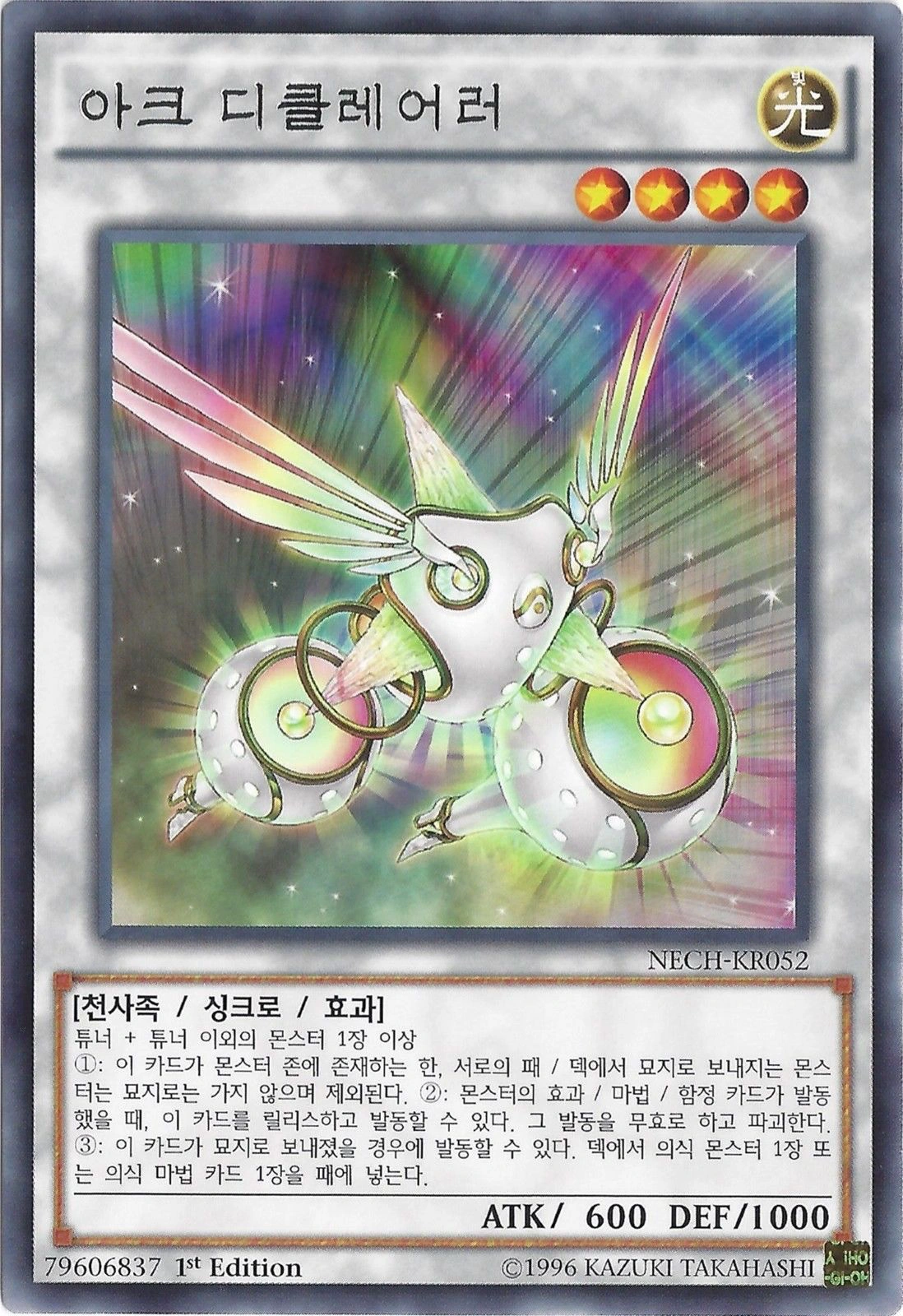 "디클레어러의 프로퍼시"에 의해 의식 소환. 패에서 천사족 몬스터 1장을 묘지로 보내고 발동한다. 상대가 발동한 효과 몬스터의 효과 / 마법 / 함정 카드의 발동을 무효로 하고 파괴한다.
