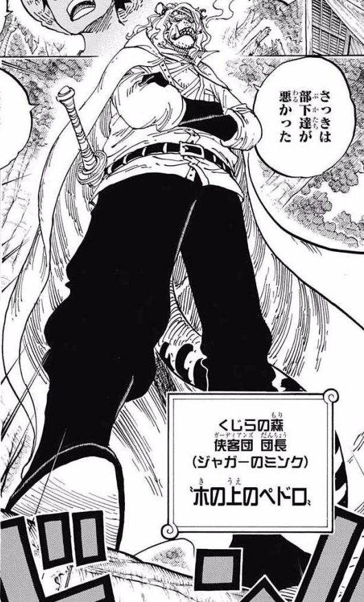 고래 숲에 침입한 루피와 가디언즈들 간의 싸움을 지켜보고 있다가 완다가 중재하자 로디와 BB를 이끌고 숲으로 돌아가는 모습으로 첫 등장. 이때는 실루엣으로만 나왔고, 나중에 과거 회상 장면에서 네코마무시와 함께 앞장서서 백수 해적단을 상대하는 모습으로 제대로 등장했다. 상디 일행이 모코모 공국에 들어왔을 때, 자신도 쓰러져 있던 와중에 부상입은 이누아라시와 네코마무시를 살려줄 것을 요청했다. 이때 상디에게 큰 도움을 받았기에 그가 나중에 빅 맘 해적단에 이송되고 이에 루피 일행이 되찾으러 가려 하자 인의를 지키기 위해서 그들을 무사히 수행하는 역할을 자청한다. 페드로 외에도 따라가려는 밍크족은 많았으나[1] 네코마무시는 페드로 한 명만 동행을 허가한다. 이유는 그가 페콤즈와 어릴 적부터 형제의 연을 맺어온 사이에다가 페콤즈를 제어할 수 있는 유일한 인물이기 때문이라고.[2]그리하여 루피 일행에 잠시 합류하게 되기는 했는데... 루피가 무모하게도 모두를 안고선 즈니샤 꼭대기에서 뛰어내리자 항상 진지했던 표정이 다 망가진 채 얼굴에 물음표를 마구 띄우며 당황한다. 나름 도와주러 왔는데 시작부터 개고생