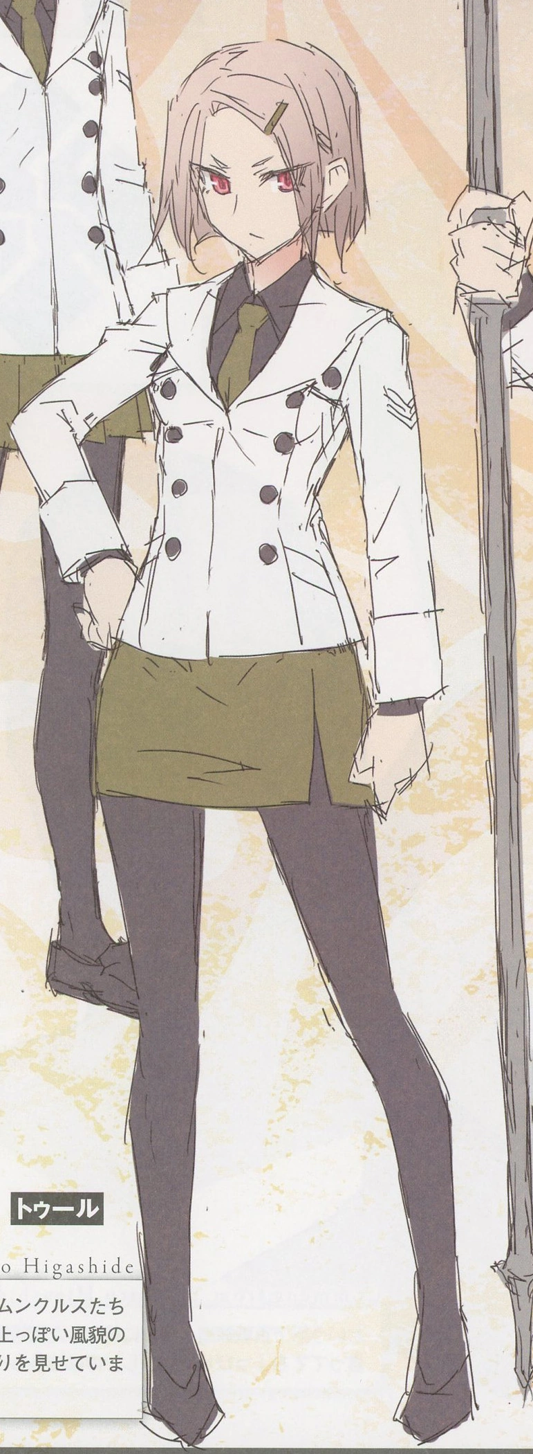 - 위그드밀레니아에 의해 주조된 호문쿨루스 소녀. 트윈테일 헤어가 특징인 캐릭터. 전투에 특화되진 않았고, 마술에 뛰어난 타입. 피오레의 소개로 룰러 일행과 함께 흑의 어새신 수색에 나선다. 성배대전이 끝나고 카우레스의 가사도우미로서 런던에 향한다. 마술보조와 사역마 탐색 아르바이트 등을 하는 중. 마술사형 호문쿨루스여서 그런지 툴보다는 수명이 더 긴 것으로 추측된다.
